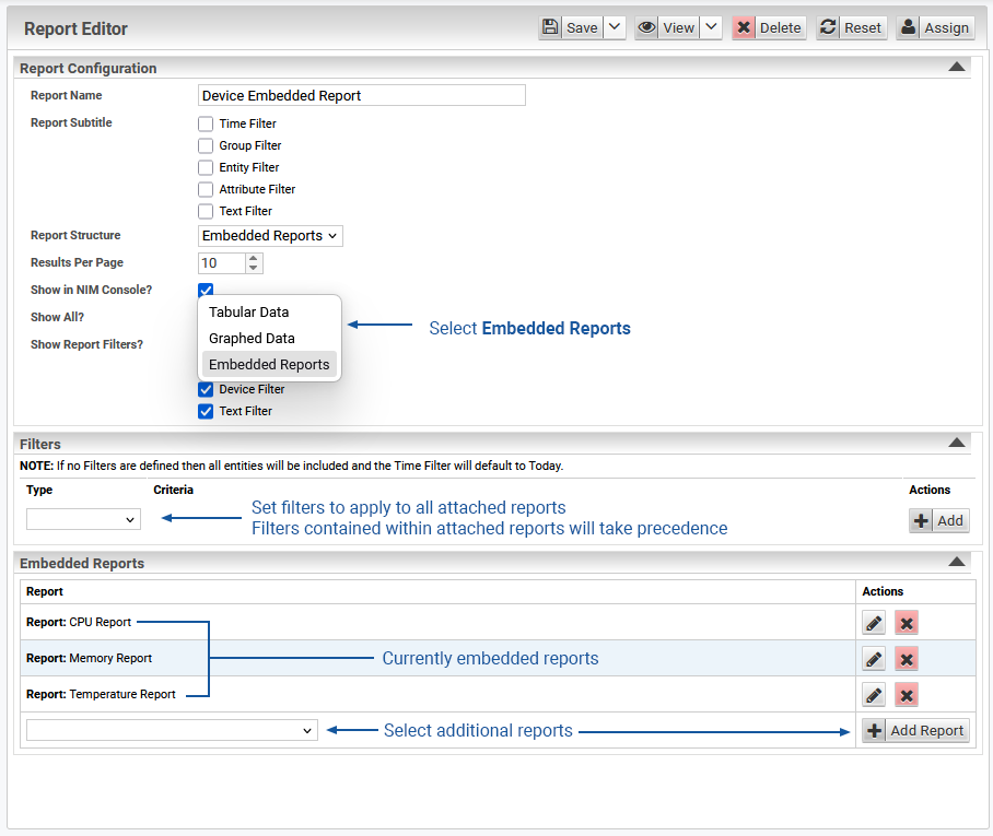 The Embedded Reports section will be displayed when Report Structure is set to Embedded Reports. This section is used to create a summary report featuring existing custom reports.