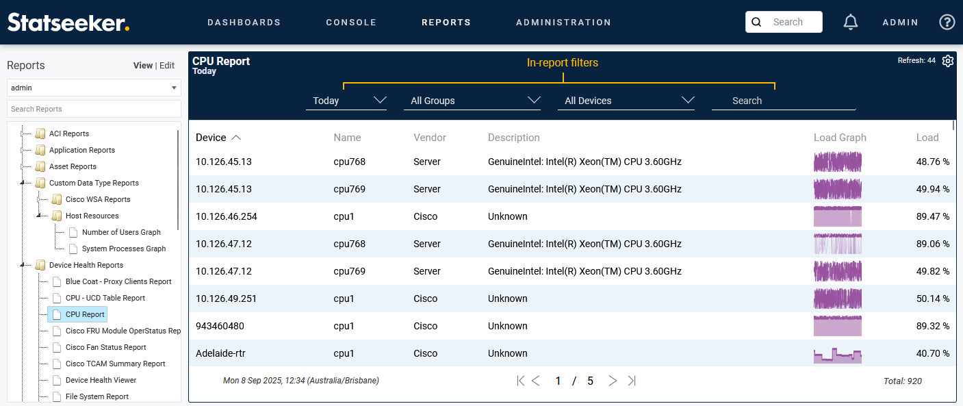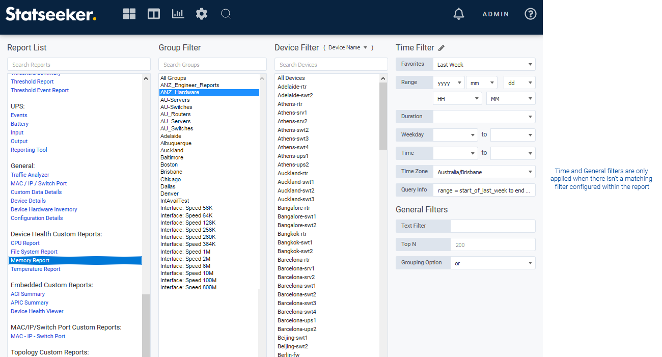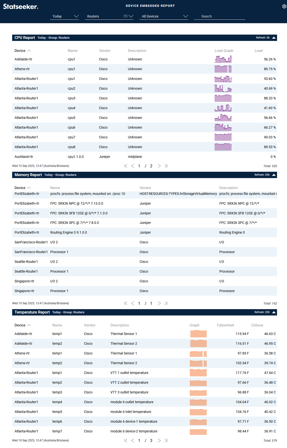 Statseeker Reporting allows you to create reports targeting any data available to Statseeker and present that information in a tabular or graphical report. Once created, reports: