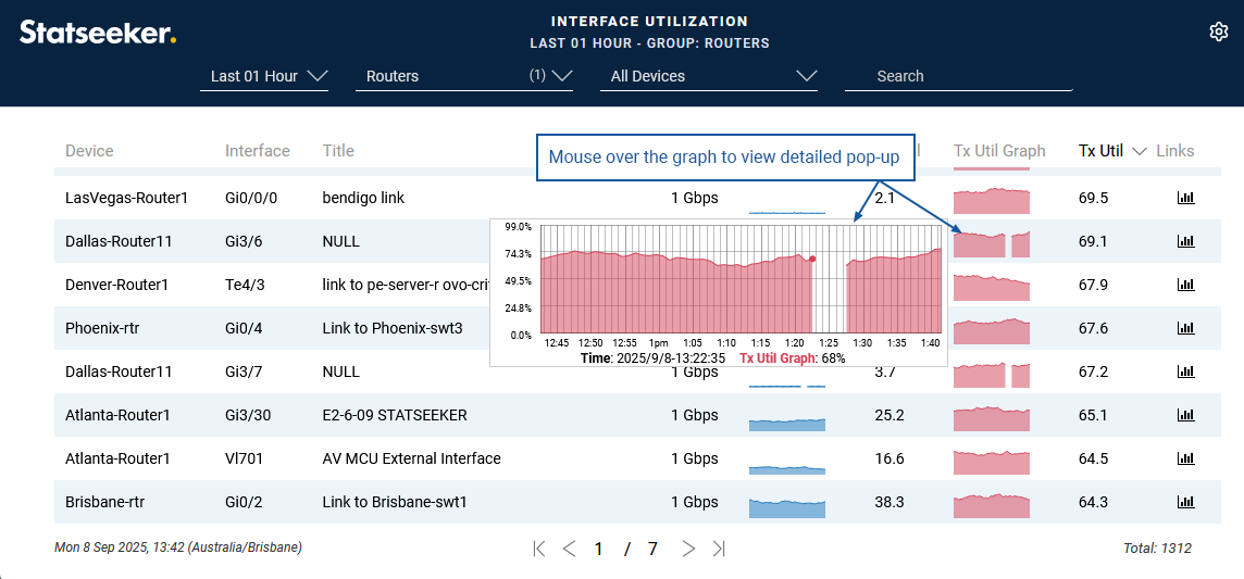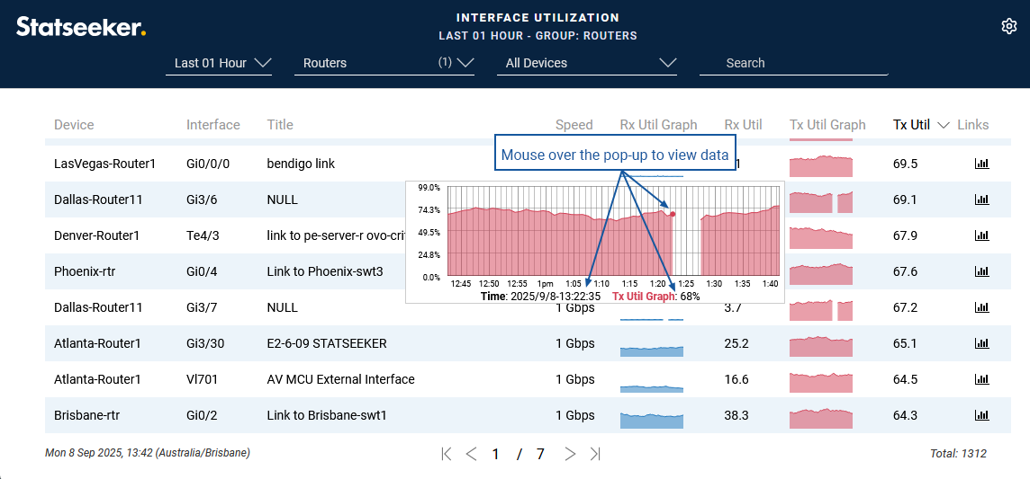 Statseeker custom reports allow you to include thumbnail graphs within tabular reports as you would with any other data. When mousing over these graphs a pop-up is displayed presenting a more detailed view of the data.