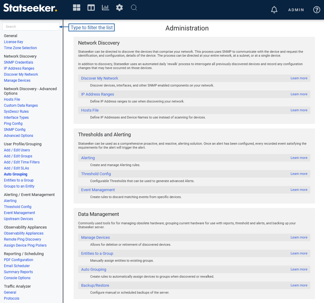 Administration is used to manage your Statseeker server and houses a large amount of functionality, including: