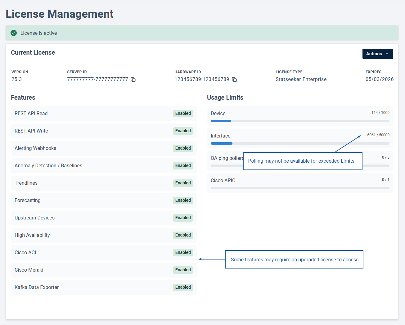 Statseeker will process the new license and display your license details.