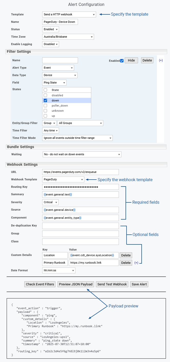 | Custom Details | Use key:value pairs to include any additional information that may be relevant to the event, or assist in alert management |