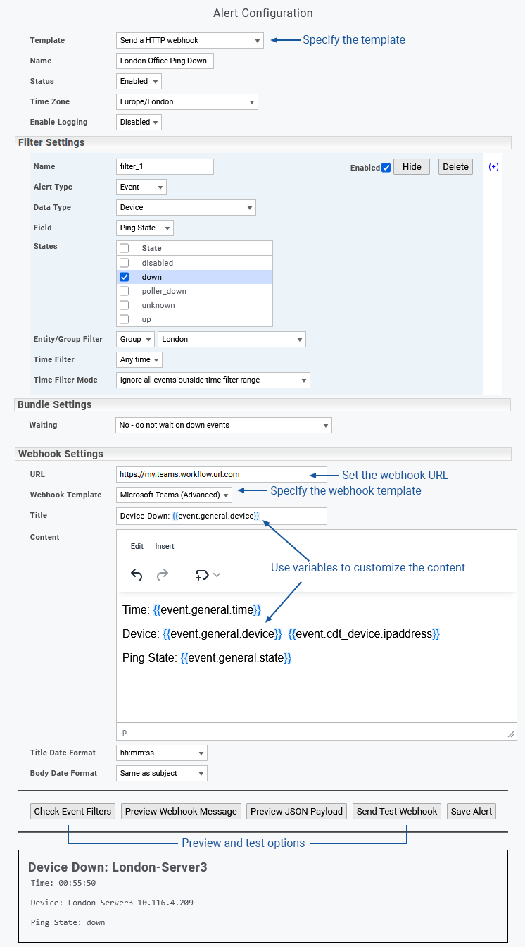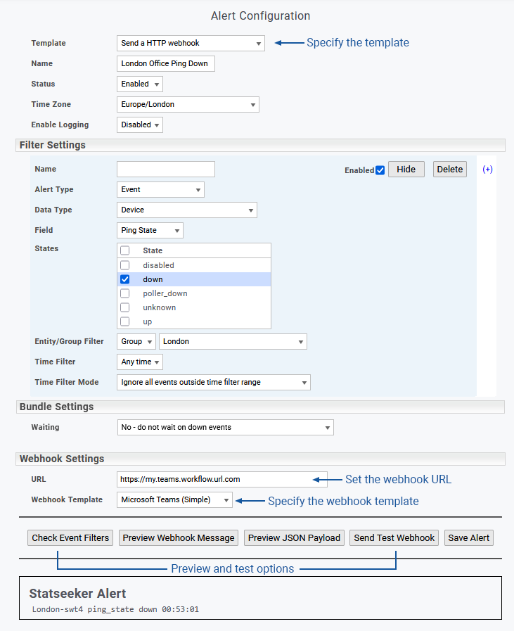 - The Webhook URL for the workspace will be referenced in the Statseeker alert configuration
