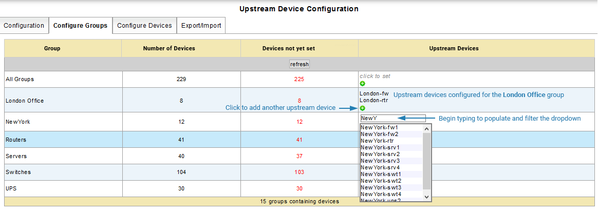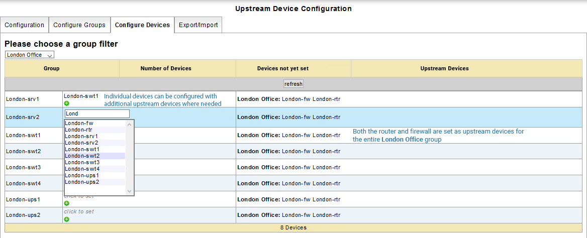 You can nominate an upstream device for all members of a group. An example of implementing this sort of configuration would be a group containing all hardware in a specific location and the nominated upstream device being the primary router for that location.