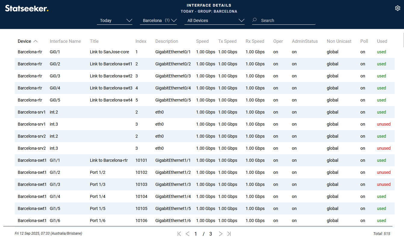 The Interface Details report provides configuration details for all interfaces on devices within the selected group/s, the data includes: