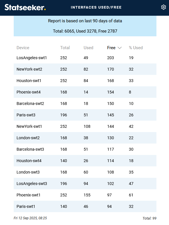 Statseeker's Interface Usage (90 Days) report offers insight into the extent and location of underutilized infrastructure on your network, potentially saving your organization a lot of time and money.