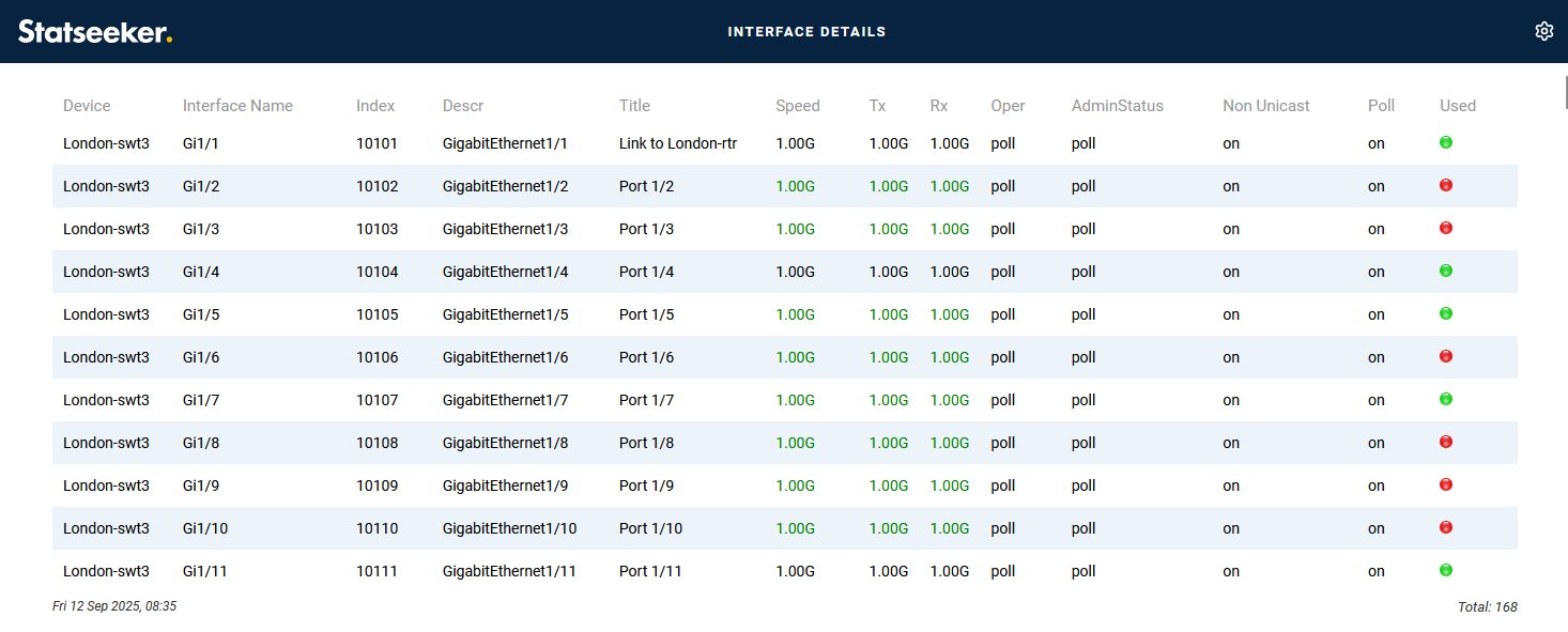 Clicking on any of the other columns in the Interface Usage (90 days) report will the Interface Details report, which can be used to see which interfaces on the report are currently unused (red).