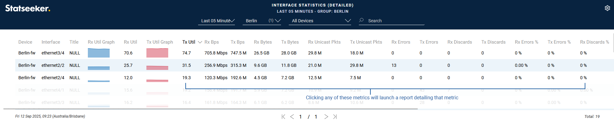 The real-time poller can be accessed from any interface metric report (Statistics, Utilization, BPS, Errors, etc., does not include events based reports such as Interface Availability). Clicking a metric value in a tabular report or a graph in a graphical report will launch an interface specific report detailing the selected metric on that interface.