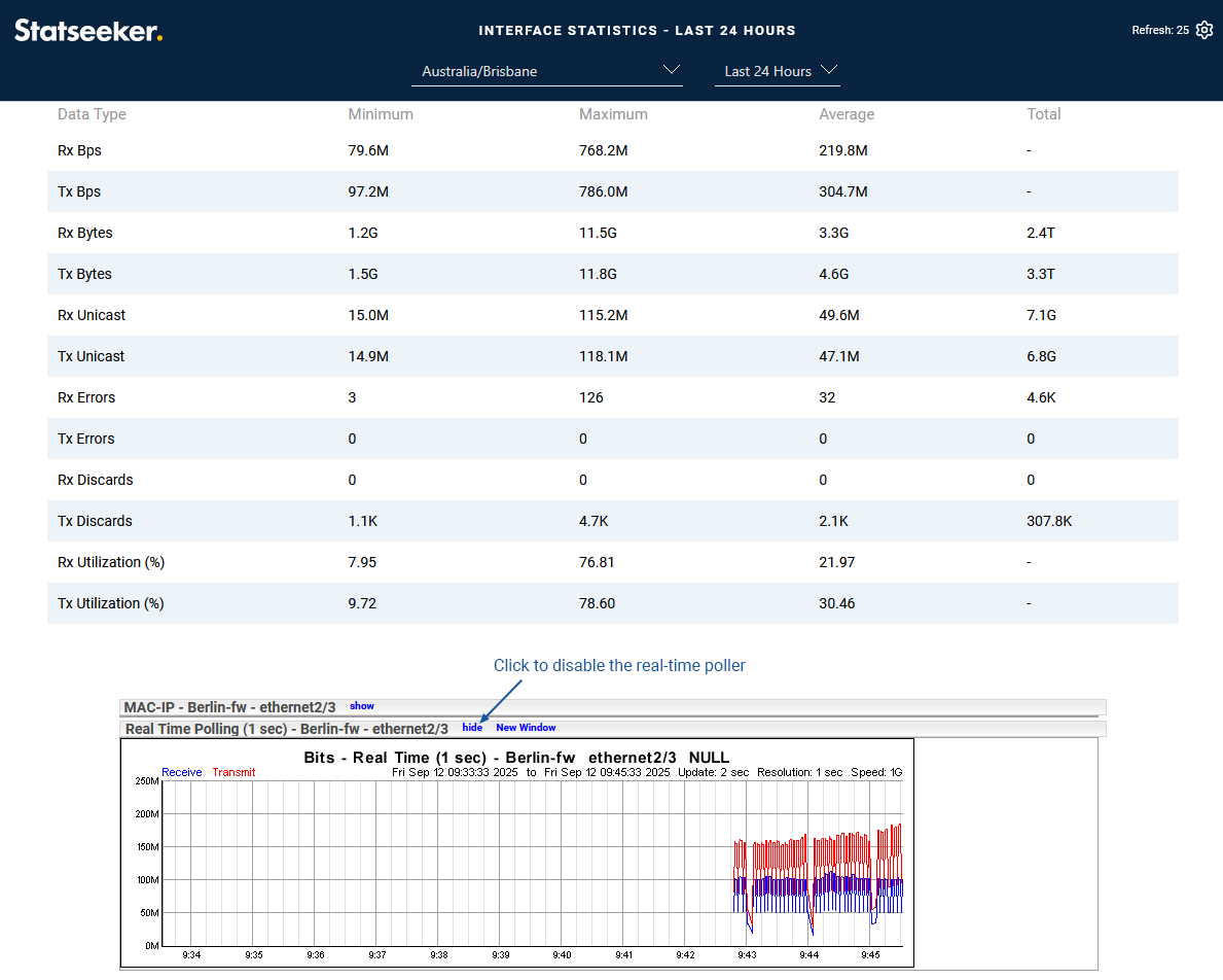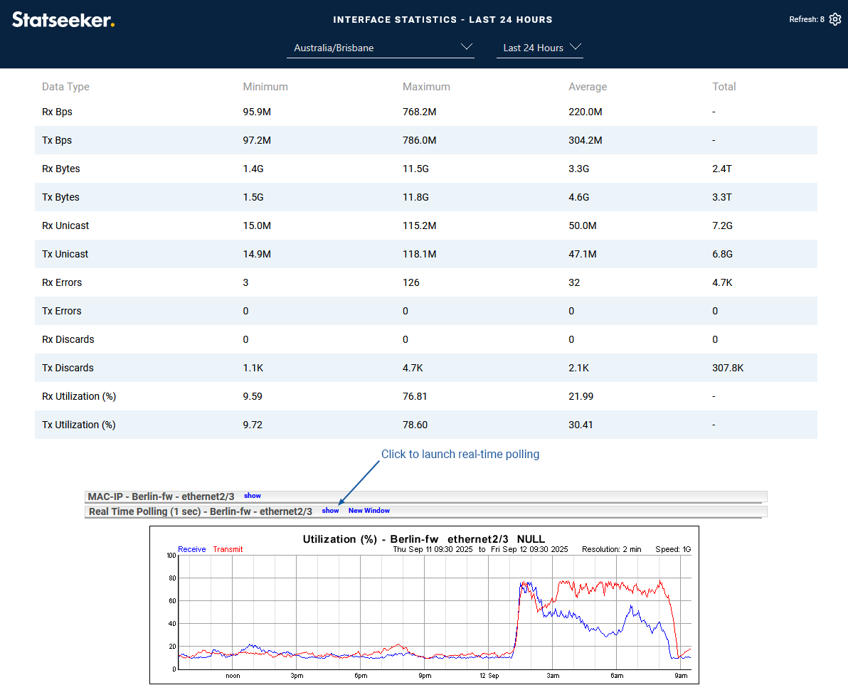 The real-time poller will query the targeted interface every second, and report both inbound and outbound traffic (in bits/s) across that interface. The polling itself will place a very minor load on the link between the interface and your Statseeker server, and does not affect the performance of that link to any significant degree.