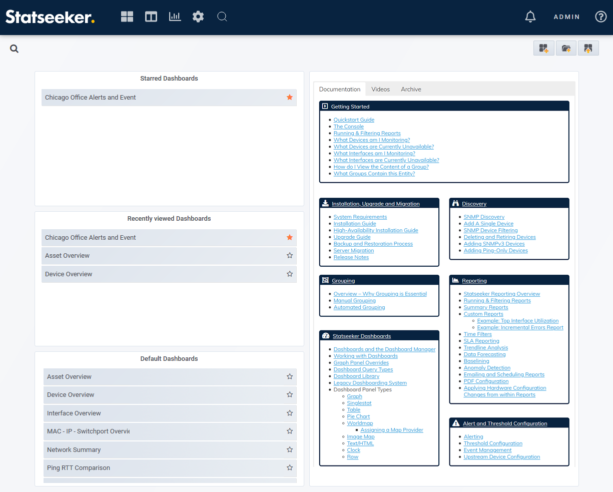 The Statseeker Dashboard Homepage will be displayed providing access to the default dashboards as well as a news panel detailing recent updates with links to associated documentation and videos. The main Statseeker Console and reporting panels are available from the main navigator.