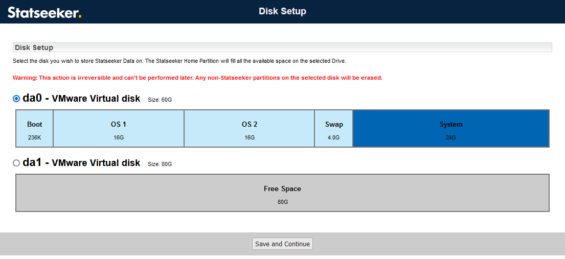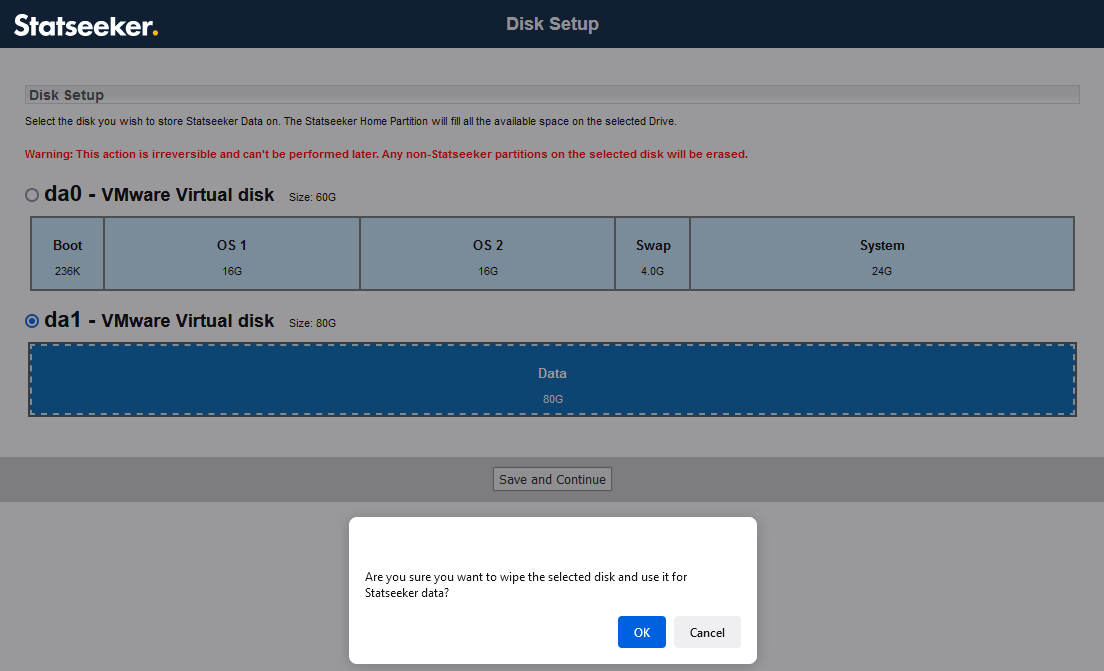 - Select the disk that will act as the Statseeker data repository - all existing data on this drive will be erased