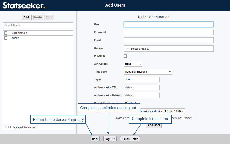 - Finish Setup - complete the installation process, you will be sent to Dashboards (the default Statseeker landing page, see Console Options for updating this default)