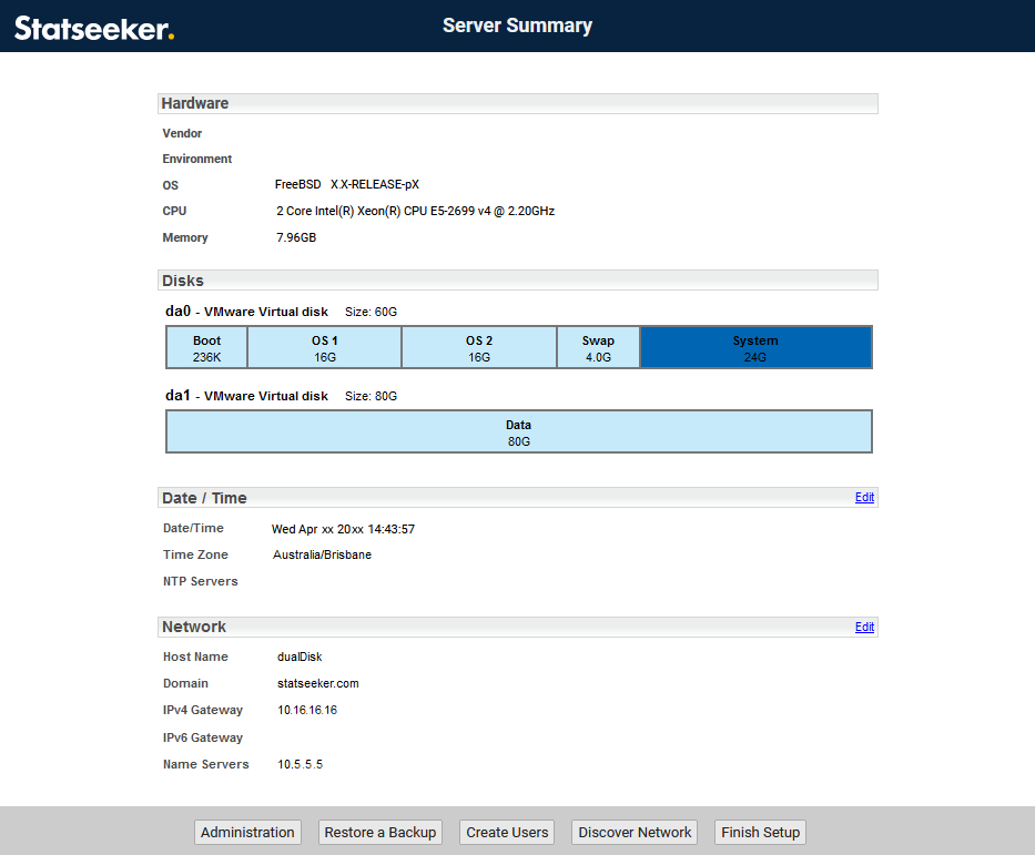 The Server Summary details the configuration of your Statseeker server with options to update this configuration and initiate basic server administration tasks.