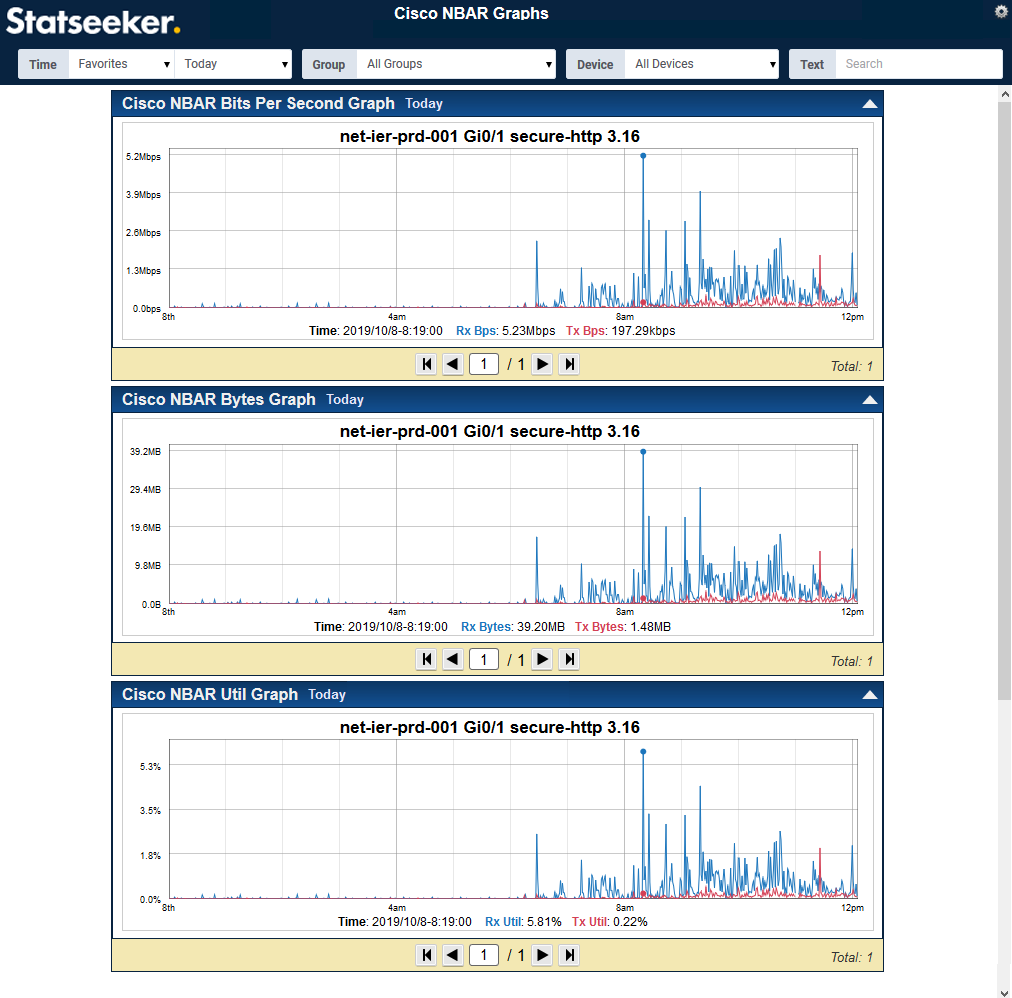 There are a 2 top-level NBAR related reports, the Cisco NBAR and Cisco NBAR Interfaces reports, (with drilldowns to additional device and/or NBAR specific reports) available on all Statseeker servers. In addition to the provided standard reports, there is the ability to create: