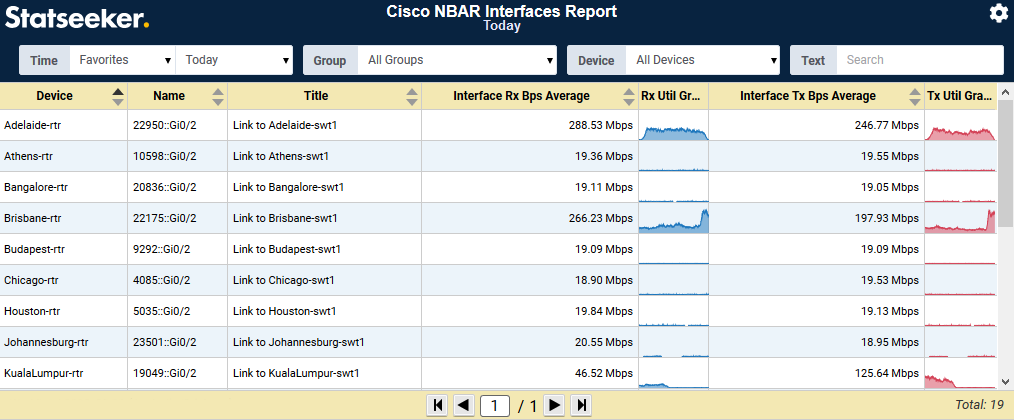 The reporting period can be altered within the report via the time selector in the report header and the report features drill downs to both the Device Viewer and NBAR Report filtered to the device/interface being selected.
