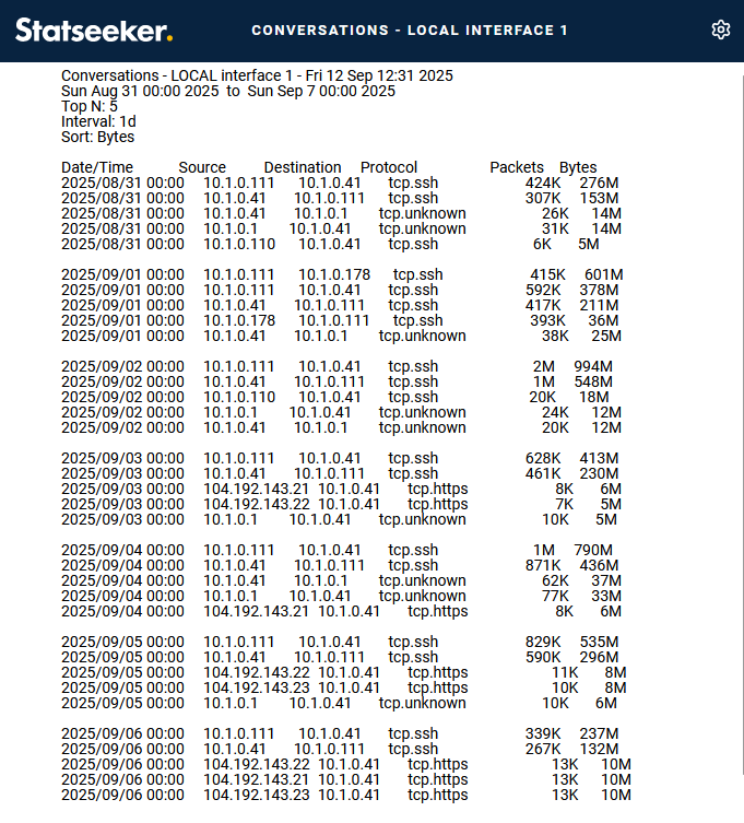 Would show the 5 largest conversations involving the target device for each day over the previous week.