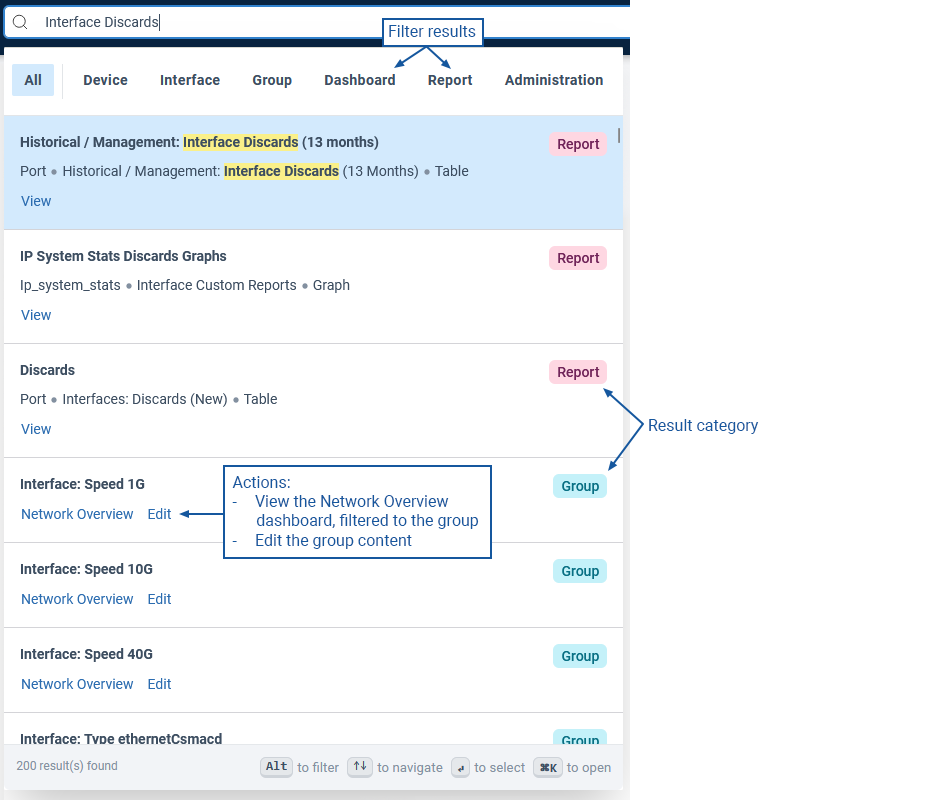 The search can be refined using filters displayed at the top of the results, allowing users to focus on specific areas such as Devices, Interfaces, Groups, Dashboards, Reports, and Administration. Each search result includes the type of entity (Device, Group, Report, etc.) and offers actions relevant to the result, such as View a report, Edit an interface configuration, or a link to a dashboard or report focused on that entity.