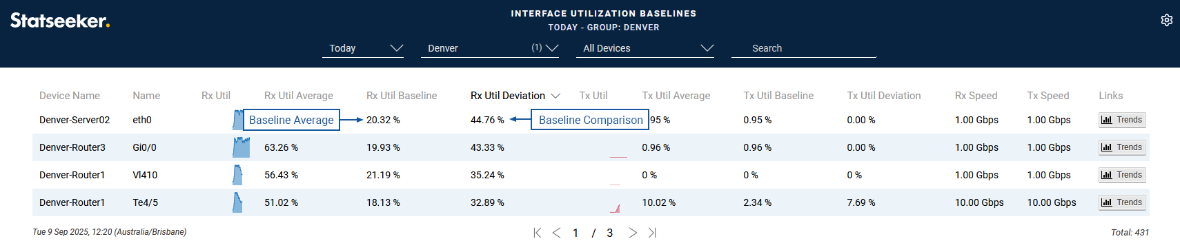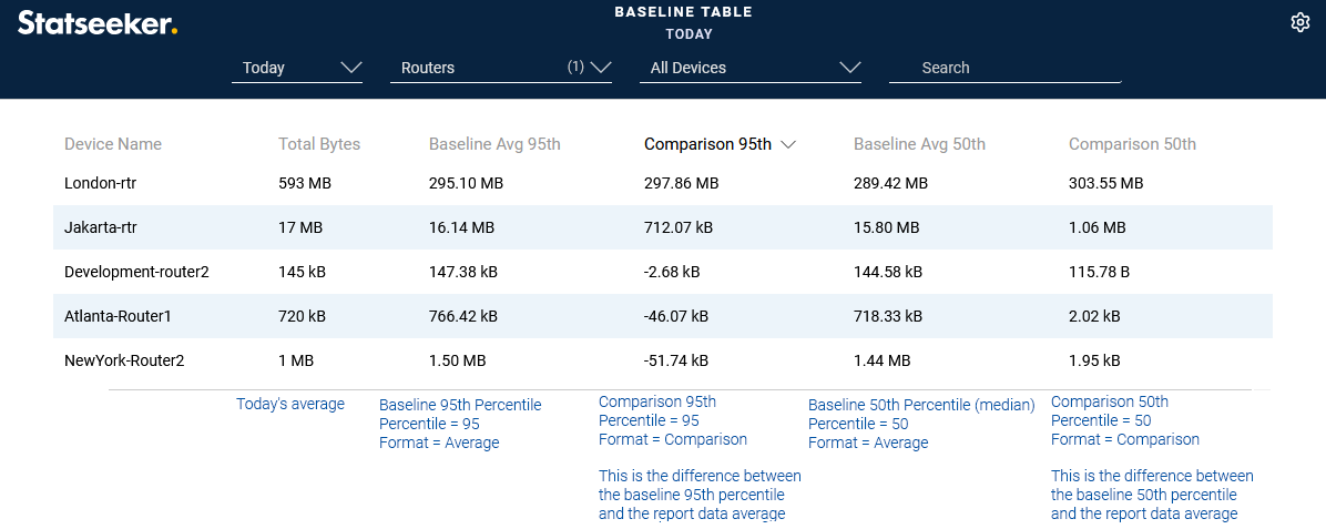 Data forecasting and anomaly detection utilize your data history to either project the way your network behavior is changing into the future (forecasting), or to compare the current network/hardware behavior to what is considered to be typical for your environment (anomaly detection). Statseeker Baselining exposes the underlying data model used to support these features, presenting your data history in an easily consumed, summarized format.