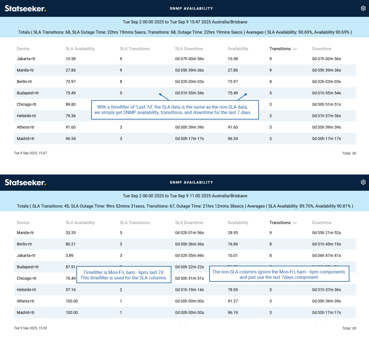 For example, rather than a time filter of the last 7 days (range = start_of_today – 7d to now;), configure a timefilter of Mon-Fri, 06:00 – 18:00, for the last 7 days (range = start_of_today – 7d to now; wday = Mon to Fri; time = 06:00 to 18:00;), then run the report using this timefilter. With this configuration you get the SNMP availability data for the total reporting (last 7 days) and availability data for just the Mon-Fri, 06:00-18:00 within those 7 days.
