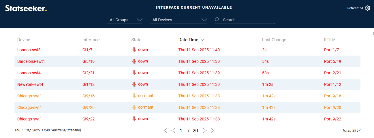 A default Statseeker installation contains a couple of ways to view details on currently down interfaces. In addition, custom reports, dashboards, and alerts can quickly and easily be configured to suit your requirements.